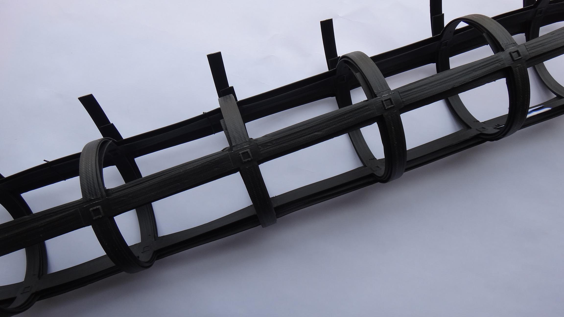 鋼塑復合土工格柵以高強鋼絲(或其他纖維),經(jīng)特殊處理,與聚乙烯(PE),并添加其他助劑,通過擠出使之成為復合型高強抗拉條帶,且表面有粗糙壓紋,則為高強度加筋土工帶。由此單帶,經(jīng)縱、橫按一定間距編制或夾合排列,采用特殊強化粘接的熔焊技術(shù)焊接其交接點而成型,則為加筋土工格柵。